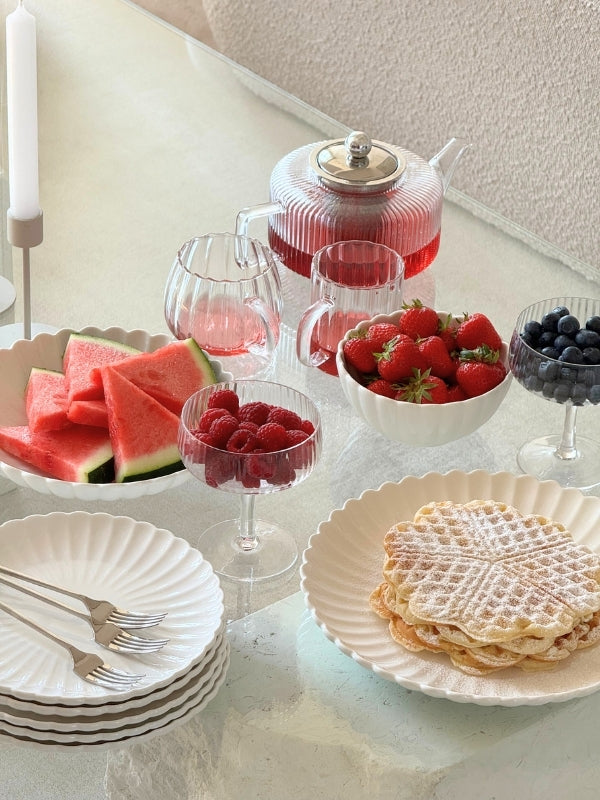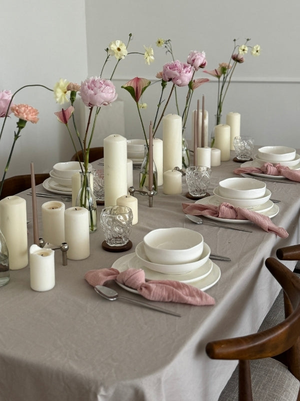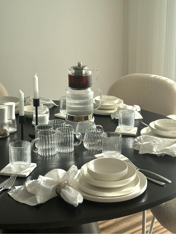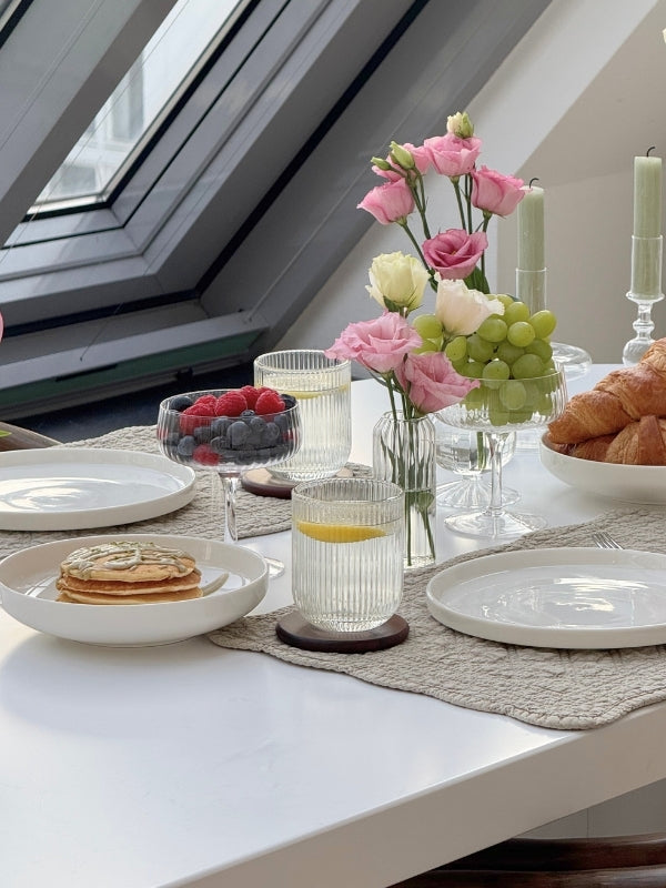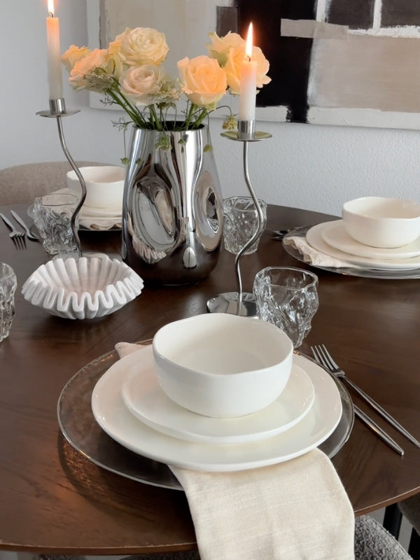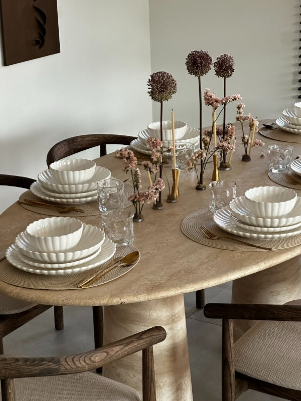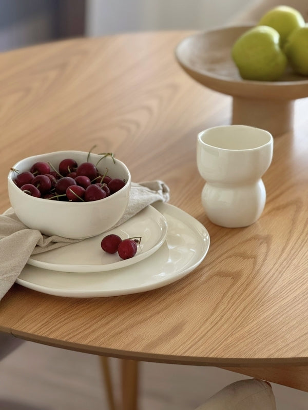 Das "Ria" Geschirrset in sanftem Beige und mit seiner einzigartig Form bringt eine natürliche Ästhetik auf den Tisch. Jedes Stück fängt das Licht auf eigene Weise ein und erzählt seine eigene Geschichte, perfekt für Momente, in denen man zusammenkommt und die einfachen Freuden des Lebens genießt.